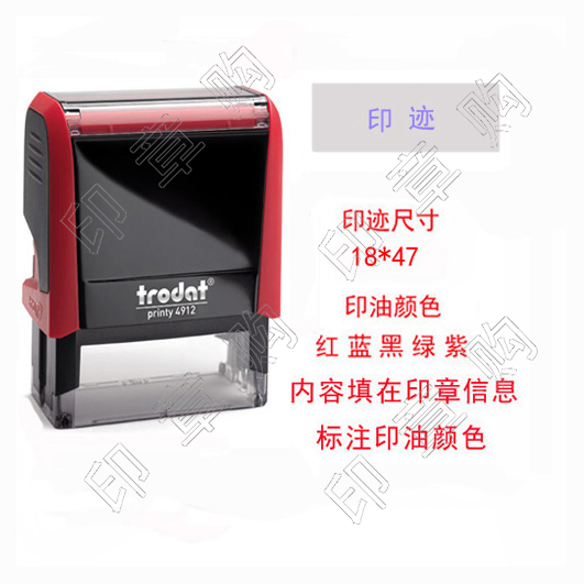 品牌:卓达规格:47 x 18mm优势:轻松盖印,印迹清晰,干净整洁,100,000次以上盖印寿命1. 使用方便——连续盖印,1次完成2. 印迹清晰——高精度,15年不退色3. 内置印台——方便注油;可更换印台4. 全景视窗——提高效率5. 精确盖印定位对准设计,防滑设计